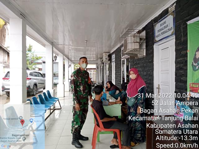 Asahan  |  Kehadiran para Babinsa diwilayah binaan dalam pendampingan vaksinasi ini bertujuan agar kegiatan berjalan aman dan tidak ada kendala yang terjadi, dalam hal in seperti yang dilaksanakan oleh Personel Bintara Pembina Desa (Babinsa) Koramil 08/Pulau Buaya jajaran Kodim 0208/Asahan Serda Faisal Lubis turun kewilayah binaan untuk melaksanakan kegiatan pendampingan Tim Vaksinator Puskesmas Bagan Asahan  Dosis l, II dan Booster dalam rangka untuk masyarakat umum agar tetap sehat dan terhindar dari Covid-19 serta selalu mematuhi Prokes bersama dengan Ibu Fika (Vaksinator), Ibu Fina (Vaksinator) dan Ibu Atun (Vaksinator), kegiatan tersebut yang dilaksanakan bertempat di Puskesmas Bagan Asahan Kecamatan Tanjung Balai Kabupaten Asahan, Kamis (31/03/2022).