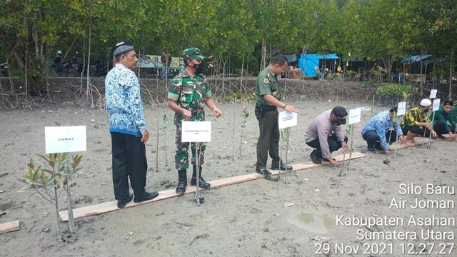 Asahan | Menurut Keputusan Presiden RI No. 24 Tahun 2008 tentang Hari Menanam Pohon Indonesia telah ditetapkan setiap tanggal 28 November sebagai Hari Menanam Pohon Indonesia, selain itu juga menetapkan bulan Desember sebagai Bulan Menanam Nasional (BMN). Berkaitan dengan hal tersebut Komandan Koramil (Danramil) 07/Air Joman Kapten Inf Syaifullah jajaran kodim 0208/Asahan (Mewakili Dandim 0208/Asahan) turut serta menghadiri kegiatan penanaman 1000 Mangrove dalam rangka memperingati Hari Menanam Pohon Nasional oleh Ikatan Pelajar Alwashliyah (IPA) Sumut, kegiatan tersebut yang dilaksanakan bertempat di (Lokasi Wisata Silau Alam Mangrove) Dusun-X Desa Silo Baru Kecamatan Silau Laut Kabupaten Asahan, Senin (29/11/2021).