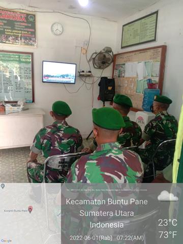 Asahan | Dalam rangka memperingati Hari Lahir Pancasila, Komandan Koramil (Danramil) 13/Buntu Pane Kapten Inf Mulyanto bersama para Babinsanya jajaran Kodim 0208/Asahan turut serta mengikuti kegiatan upacara secara virtual Peringatan Hari Lahir Pancasila 2022 dengan Tema Bangkit Bersama Membangun Peradaban Dunia, kegiatan tersebut yang dilaksanakan bertempat di Kantor Koramil 13/Buntu Pane Desa Sei Silau Timur Kecamatan Buntu Pane Kabupaten Asahan, Rabu (01/06/2022).