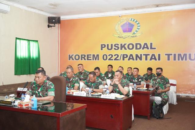 Pematang Siantar | Komandan Korem (Danrem) 022/Pantai Timur Kolonel Inf Luqman Arief, S.I.P., didampingi para Dandim jajaran Korem 022/PT dan para Kasi Rem 022/PT serta para Perwira, turut serta mengikuti kegiatan Taklimat Awal Was Current Audit Itjenad TA. 2022 secara Virtual, kegiatan tersebut yang dilaksanakan bertempat di Ruang Pus Kodal Korem 022/PT, Jalan Asahan Km. 3,5 Nagori Siantar Estate Kecamatan Siantar Kabupaten Simalungun, Senin (10/10/2022).