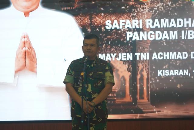 Asahan | Dalam rangka meningkatkan keimanan dan ketaqwaan kepada Allah SWT serta mempererat tali silaturahmi antara Ukhuwah Islamiyah, mewujudkan masyarakat Asahan Sejahtera yang Religius dan Berkarakter, Pangdam l/Bukit Barisan Mayjen TNI Achmad Daniel Chardin, S.E, M.Si, Bersama Rombongan yang didampingi oleh Danrem 022/Pantai Timur Kolonel Inf Luqman Arief, S.I.P., serta para Dandim jajaran Korem 022/PT turut serta melaksanakan Safari Ramadhan ke Kisaran Kabupaten Asahan, kegiatan tersebut yang dilaksanakan bertempat di Aula Pendopo Bupati Asahan, Jalan Lintas Sumatra Lingkungan 6 Kelurahan Mekar Baru Kecamatan Kisaran Barat Kabupaten Asahan, Senin (17/04/2023).