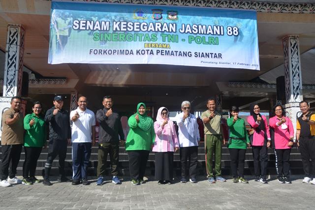 Pematang Siantar  |  Dalam rangka menjaga kebugaran fisik dan kesehatan serta untuk menjaga Sinergitas TNI-Polri bersama Forkopimda dan warga Masyarakat Kota Pematang Siantar dengan melaskanakan kegiatan Senam Kesegaran Jasmani 88, kegiatan tersebut yang digelar di Lapangan Haji Adam Malik Jalan Proklamasi Kecamatan Siantar Kota Pematang Siantar, Jumat (17/02/2023).
