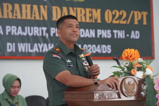 Setelah menerima paparan Dandim 0204/DS, Letkol Czi Yoga Febrianto, SH, MSi, Danrem 022/PT kemudian memberi pengarahan kepada Prajurit, PNS dan Ibu-ibu Persit KCK Cabang XXXIII Kodim 0204/DS di Aula Pendawa Sakti Makodim 0204/DS.