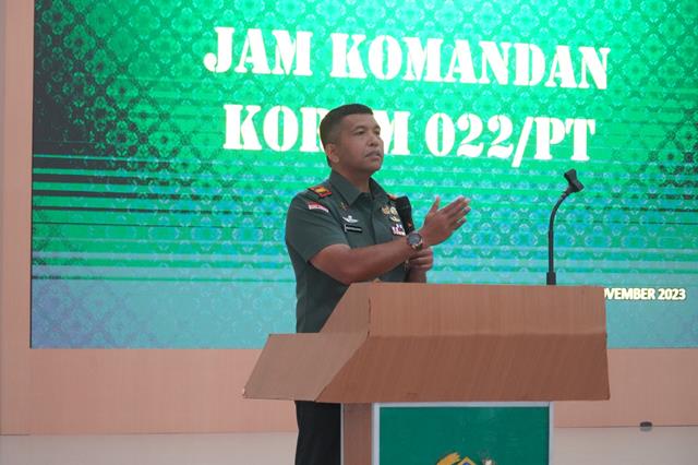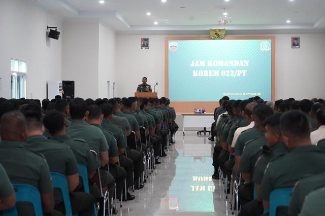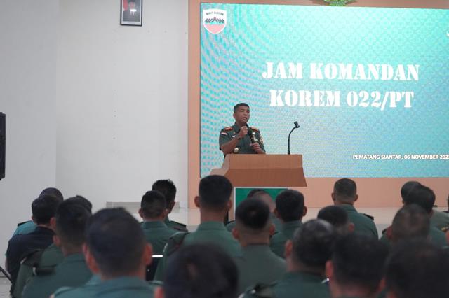 Dalam kesempatan ini Komandan Korem 022/Pantai Timur Kolonel Inf Agustatius Sitepu, S.Sos., M.Si., M.Han, memberikan Jam Komandan serentak diseluruh jajaran, baik Kodim jajaran maupun Satuan Dinas Jawatan yang ada di wilayah Korem 022/PT. dengan penekanan tentang masalah Disiplin Prajurit dan Netralitas TNI kepada seluruh Prajurit dan PNS Korem 022/Pantai Timur, kegiatan tersebut yang dilaksanakan bertempat di Aula Pantai Timur Korem 022/PT Jalan Asahan Km. 3,5 Nagori Siantar Estate Kecamatan Siantar Kabupaten Simalungun, Senin (06/11/2023).