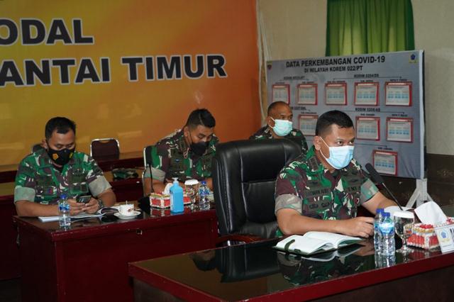 P.Siantar – Danrem 022/PT Kolonel Inf Luqman Arief . S.I.P mengikuti rapat dengan Panglima TNI, Jenderal TNI Andika Perkasa dalam rangka Perkembangan Capaian Vaksinasi Astra Zeneca Yang akan Kadaluarsa di bulan Februari yang dilaksanakan secara virtual di ruang Pukodal Korem 022/PT Jalan Asahan Km 3,5 Kec.Siantar Kab.Simalungun. Rabu ( 23/2/2022).