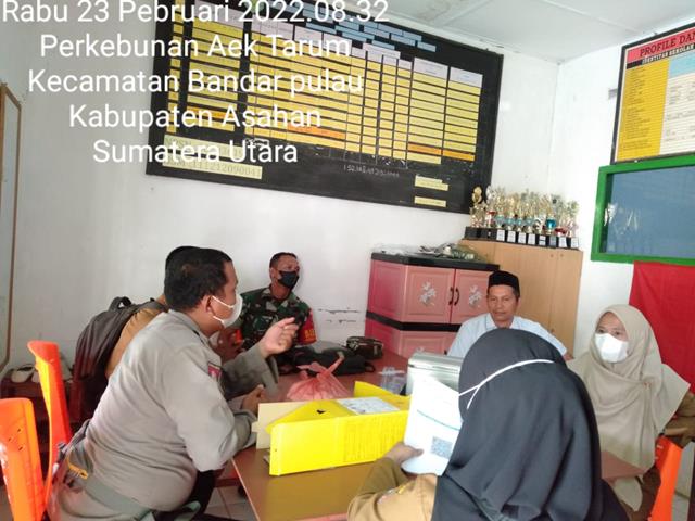 Asahan | Dalam rangka pendataan ulang anak sekolah yang belum melaksanakan Vaksinasi diwilayah binaan, dalam hal ini seperti yang dilakukan oleh Personel Bintara Pembina Desa (Babinsa) Koramil 15/Bandar Pulau jajaran Kodim 0208/Asahan Serda Erianto Bersama Babinkamtibmas beserta Team Kesehatan dari Puskesmas turun kewilayah binaan dalam rangka untuk mendatangi Sekolah untuk berkoordinasi serta memintai data murid yang sudah dan yang belum melaksanakan Vaksinasi Tahap I dan II sehingga Program Vaksinasi dapat tercapai dan terlaksana secara merata, kegiatan tersebut yang dilaksanakan bertempat di Desa Perkebunan Aek Tarum Kecamatan Bandar Pulau Kabupaten Asahan, Rabu (23/02/2022).