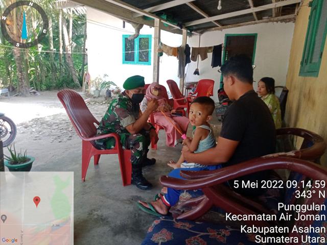 Asahan  |  Guna mendukung Tugas Pokok sebagai seorang Babinsa serta terwujudnya Kemanunggalan TNI dengan Rakyat, dalam hal ini seperti yang dilakukan Personel Bintara Pembina Desa (Babinsa) Koramil 07/Air Joman jajaran Kodim 0208/Asahan Serda Eri Susanto secara rutin dan berkesinambungan melaksanakan Komunikasi Sosial (Komsos) serta melaksanakan Anjangsana  kerumah Bapak Candra tokoh pemuda dengan masyarakat di wilayah Desa Binaan, kali ini dia melaksanakan Anjangsana dan Komsos dengan warga masyarakat binaan di desa binaan diantaranya adalah Bapak Candra (Tokoh Pemuda), Ibu Kiki Rahayu (Keluarga), Ibu Saminem (Keluarga) dan Yudha (Anak),  kegiatan tersebut yang dilaksanakan bertempat di Dusun-III Desa Punggulan Kecamatan Air Joman Kabupaten Asahan, Kamis (05/05/2022).