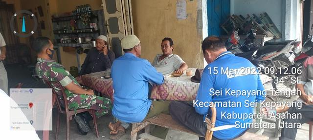 Asahan | Agar terjalinnya hubungan yang baik antara Babinsa dan warga binaan, kegiatan komunikasi sosial ini merupakan satu Kemampuan dari Lima Kemampuan Pembinaan Teritorial yang wajib di kuasai oleh seluruh Personel Babinsa umumnya. Seperti yang dilakukan oleh Personel Bintara Pembina Desa Koramil 10/Sei Kepayang jajaran Kodim 0208/Asahan Serda Dedy Surya turun kewilayah desa binaan untuk melaksanakan Komunikasi Sosial (Komsos) bersama warga masyarakat binaan sekaligus Pembagian Masker serta memberikan himbauan dan mengajak Masyarakat agar ikut Vaksin serta tetap menggunakan Masker dan mematuhi Protokol Kesehatan yang sedang berbincang bincang dengan warga membicarakan tentang perkembangan situasi dan kondisi perekonomian yang semakin sulit, juga untuk keamanan wilayah Desa, kegiatan tersebut dalam rangka untuk mempererat silaturrahmi di desa binaan, kegiatan tersebut yang dilaksanakan bertempat di Warung Kopi Bapak Taupik Jln. Tanjung Balai – Tanjung Ledong Dusun I Desa Sei Kepayang Tengah Kabupaten Asahan, Selasa (15/03/2022).