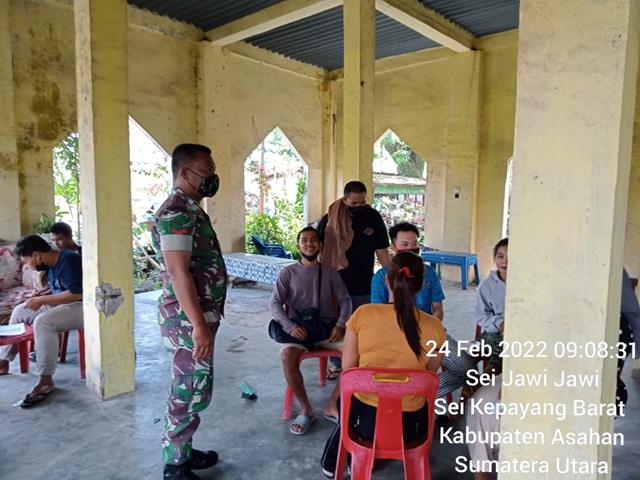 Asahan  |  Dalam rangka agar Masyarakat selalu menjaga kesehatan guna memutus penyebaran mata rantai Virus Corona (Covid-19). Dalam hal ini seperti yang dilakukan oleh Personel Bintara Pembina Desa (Babinsa) Koramil 10/Sei Kepayang jajaran Kodim 0208/Asahan Kopda MD Sihombing turun kewilayah binaan untuk melaksanakan himbauan dalam rangka Pendisiplinan Adaptasi kebiasaan baru dan dalam rangka mencegah Penyebaran Pandemi Virus Corona ( Covid – 19 ) dengan Mitra Karib untuk menjalin hubungan tali silahturahmi dan kerja sama yang baik dalam membantu tugas pokok TNI, kegiatan tersebut yang dilaksanakan bertempat di Desa Sei Jawi Jawi Kecamatan Sei Kepayang Barat Kabupaten Asahan, Kamis (24/02/2022).