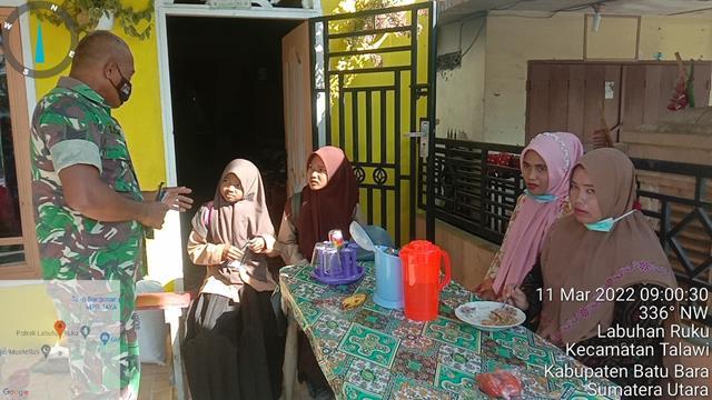 Batu Bara  |  Agar Terjalinnya hubungan yang harmonis antara Masyarakat dengan Babinsa, Komsos dengan warga desa akan meningkatkan kerja sama antara Babinsa dan Masyarakat Desa untuk menciptakan keakraban, kerukunan dan keamanan di lingkungan. Selain itu, kegiatan ini lebih efektif karena bisa saling tukar menukar informasi, sehingga nantinya warga dapat memperoleh informasi dan mengetahui permasalahan- permasalahan yang dihadapi saat ini. Seperti yang dilakukan oleh Personel Bintara Pembina Desa Koramil 04/Talawi jajaran Kodim 0208/Asahan Serma Sp Saragi turun kewilayah desa binaan untuk melaksanakan Komuniukasi Sosial (Komsos) bersama dengan warga desa binaan, sekaligus menghimbau agar untuk selalu mematuhi protokol kesehatan dan menghimbau Warga untuk melaksanakan Vaksinasi secara lengkap, kegiatan tersebut yang dilaksanakan bertempat di warung Bapak Darwin tepatnya berposisi di Kelurahan Labuhan Ruku Kecamatan Talawi Kabupaten Batu Bara, Jumat (11/03/2022).