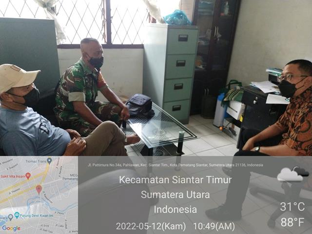 Pematang Siantar  |  Guna mengetahui perkembangan di Wilayah Binaan, seperti halnya yang dilakukan oleh Personel Bintara Pembina Desa (Babinsa) Koramil 02/Siantar Timur jajaran Kodim 0207/Simalungun Serka Supriadin turun kewilayah binaan untuk melaksanakan kegiatan Puldata dalam rangka peningkatkan keamanan dalam di wilayah binaan bersama warga Kel Pahlawan agar tetap terjalin hubungan baik dengan warga binaannya bersama dengan Bapak Lurah Ariandi Sos, kegiatan tersebut yang dilaksanakan bertempat di Kantor Lurah Pahlawan di Jalan Patimurah Kelurahan Pahlawan Kecamatan SIantar Timur Kota Pematang SIantar, Kamis (12/05/2022).