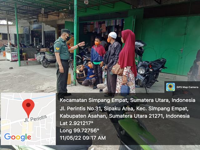 Asahan | Agar Warga yang pulang mudik dapat menjaga keamanan dirinya dan barang bawaan, lebih berhati-hati selama dalam perjalanan dan mematuhi prokes serta masyarakat yang belum mematuhi protokol kesehatan, untuk memakai masker, menjaga jarak dan mencuci tangan, agar terhindar dari penyebaran virus Corona (Covid-19) serta terjalinnya kerjasama yang baik antara TNI-Masyarakat, dengan mendukung langkah pemerintah, untuk memutus mata rantai penyebaran virus corona (Covid-19), seperti halnya yang dilakukan oleh Personel Bintara Pembina Desa Koramil 11/Simapng Empat jajaran Kodim 0208/Asahan Serka Adi S Sirait turun langsung kewilayah binaan untuk melaksanakan kegiatan Komunikasi Sosial (Komsos) bersama dengan Bapak Pairan yang sedang menunggu Bus bersama keluarganya dengan tujuan pulang mudik untuk kembali ke Pekan Baru, Memberikan himbauan agar selama diperjalanan menjaga keamanan diri keluarga dan barang-barang bawaan jangan sampai tertinggal dan tetap patuhi prokes, selalu memakai masker untuk memutuskan rantai perkembangan Covid-19, bersama dengan Bapak Pairan, Ibu Ida, Bapak Hasan, Bapak Husein dan Bapak Afdal, kegiatan tersebut yang dilaksanakan bertempat di Jalan Printis Desa Simpang Empat Kecamatan Simpang Empat Kabupaten Asahan, Rabu (11/05/2022).