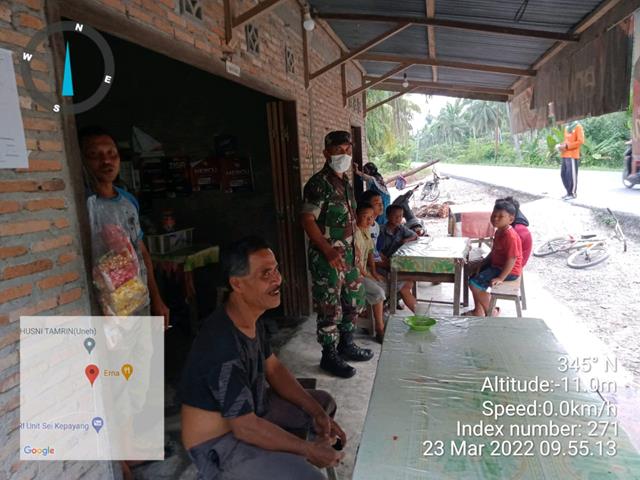 Asahan | Supaya terjalin Silaturahmi yang Harmonis antara babinsa dengan Masyarakat, dalam hal ini seperti yang dilakukan oleh Personel Bintara Pembina Desa Koramil 10/Sei Kepayang jajaran Kodim 0208/Asahan Serka J.H Lubis turun kewilayah binaan untuk melaksanakan kegiatan memberikan himbauan kepada warga masyarakat terlebih anak-anak yang sedang bermain diluar rumah agar tetap mamatuhi Protokol kesehatan dalam rangka agar terhindar dari virus corona Covid-19, kegiatan tersebut yang dilaksanakan bertempat di Dusun 1 Desa Sei Kepayang Kanan Kecamatan Sei Kepayang Kabupaten Asahan, Rabu (23/03/2022).