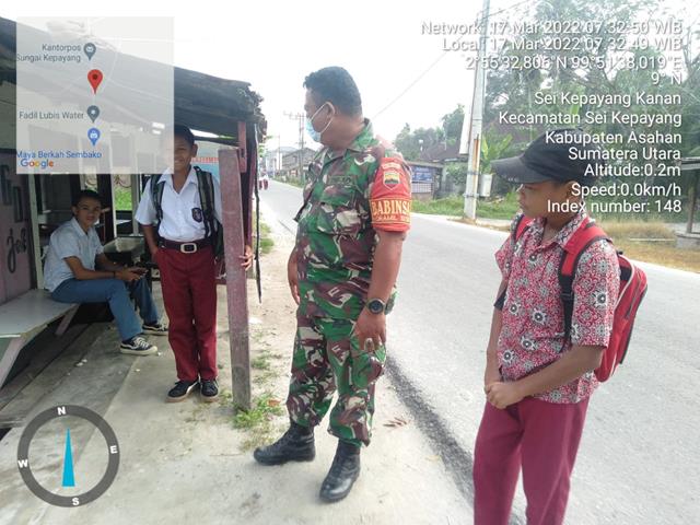 Asahan | Agar terjalinnya hubungan yang baik dan harmonis antara Babinsa Koramil 10/SK dengan warga masyarakat Sei Kepayang Kanan serta agar masyarakat dan TNI dapat berbaur, serta terjalin nya kerja sama yang baik antara TNI-Rakyat, dalam hal ini Personel Bintara Pembina Desa Koramil 10/Sei Kepayang jajaran Kodim 0208/Asahan Serma Supriono turun kewilayah desa binaan untuk melaksanakan kegiatan Komunikasi Sosial (Komsos) bersama dengan masyarakat selaku dengan anak Sekolah di Desa Sei Kepayang Kanan dan menghimbau kepada Murid agar tetap mematuhi Protokol Kesehatan, sekaligus menghimbau Masyarakat agar melaksanakan Vaksinasi untuk menambah Imun dalam tubuh serta selalu memperhatikan Protokol Kesehatan, kegiatan tersebut yang dilaskanakan bertempat di Warung Bapak Wahap Jalan Tanjung Balai-Tanjung Ledong Dusun 2 Desa Sei Kepayang Kanan Kecamatan Sei Kepayang Kabupaten Asahan, Kamis (17/03/2022).