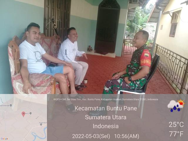Asahan  |  Dalam masa Pandemi Covid 19 yang belum berakhir, dalam rangka agar terjalinnya komunikasi yang baik antara Babinsa dengan masyarakat, dalam hal ini Personel Bintara Pembina Desa (Babinsa) Koramil 13/Buntu Pane jajaran Kodim 0208/Asahan Sertu Sugeng turun kewilayah binaan untuk melaksanakan kegiatan Komunikasi Sosial (Komsos) sekaligus melaksanakan memberikan dan menghimbau masyarakat supaya tetap mematuhi protokol kesehatan serta untuk mempererat Hubungan antara Babinsa dan masyarkat agar lebih mudah mendapatkan informasi dan perkembangan situasi di wilayah Desa Binaan bersmaa dengan Tokoh Pemuda Bapak Gustiwana dan Mitra Karib Bapak Andi, kegiatan tersebut yang dilaksanakan bertempat di Desa Sei Silau Timur Kecamatan Buntu Pane Kabupaten Asahan, Selasa (03/05/2022).