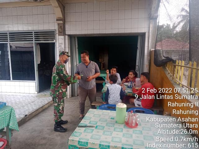 Asahan | Untuk menciptakan kerja sama dan menjaga hubungan silaturahmi yang baik antara Babinsa dengan Masyarakat desa serta untuk meningkatkan kepedulian masyarakat desa guna mendukung tugas Pokok Babinsa, agar terjalinnya komunikasi yang baik antara babinsa dengan masyarakat desa binaan, dalam pelaksanaan Komunikasi Sosial yang dilakukan oleh Personel Bintara Pembina Desa (Babinsa) Koramil 16/Pulau Rakayat jajaran Kodim 0208/Asahan Serda Monang Sitorus dan Kopda Kadir A. Razak turun kewilayah binaan untuk melaksanakan kegiatan Komunikasi Sosial (Komsos) bersama dengan Masyarakat Warga Desa Binaan, dalam rangka menghimbau serta mengajak agar tetap mematuhi Protokol Kesahatan sekaligus membagikan Masker dalam hal ini warga sangat antusias dalam mendengar kan penyampaian Babinsa dan selalu mengikuti protokuler kesehatan demi menjaga kesehatan dan berterima kasih kepada Babinsa karena sudah mau mengingatkan kami.