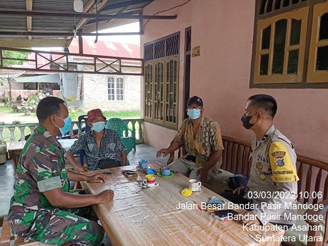Asahan | Dalam rangka untuk menciptakan dan meningkatkan kerja sama yang baik, dan menjaga silatuhrahmi antara TNI dan Masyarakat, serta untuk menciptakan kemanunggalan TNI dan Rakyat, dalam rangka pencegahan penyebaran Wabah Virus Corona (Covid-19), dalam hal ini seperti yang dilakukan oleh Personel Bintara Pembiona Desa (Babinsa) Koramil 14/Bandar Pasir Mandoge jajaran Kodim 0208/Asahan Serda Sudarman turun kewilayah binaan untuk melaksanakan Komunikasi Sosial (Komsos) bersama dengan warga masyarakat diwilayah binaan dengan menyampaikan himbauan agar masyarakat yang belum melaksanakan Vaksin khususnya Lansia serta tentang Disiplin Protokol Kesehatan diwilayah tersebut bersama dengan Babinkamtibmas Aipda Suhardi, Baapk Rusdi dan Bapak Hariyono, kegiatan tersebut yang dilaksanakan bertempat di Dusun l Desa Bandar Pasir Mandoge Kecamatan Bandar Pasir Mandoge Kabupaten Asahan, Kamis (03/03/2022).