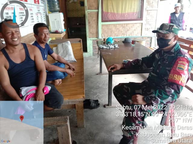 Batu Bara | Agar terjalinnya Tali Silahturami dan saling tukar informasi serta tetap menjaga Keamanan dan Ketertiban serta melaporkan setiap perkembangan situasi Desa, dalam hal ini seperti yang dilakukan oleh Personel Bintara Pembina Desa (Babinsa) Koramil 01/Medang Deras jajaran Kodim 0208/Asahan Sertu B. Harapan turun kewilayah desa binaan untuk melaksanakan Komunikasi Sosial (Komsos) dengan Warga Desa Binaan dan menghimbau kepada masyarakat agar tetap mematuhi Protokol kesehatan bersama dengan Bapak Sujadi, Bapak Rusdi dan Bapak Riduan membahas tentang Keamanan dan Ketertiban Desa juga sekaligus membicarakan akan diberlakukan Pos Kamling, kegiatan tersebut yang dilaksanakan bertempat di Kelurahan Pangkalan Dodek Baru Kecamatan Medang Deras Kabupaten Batu Bara, Sabtu (07/05/2022).