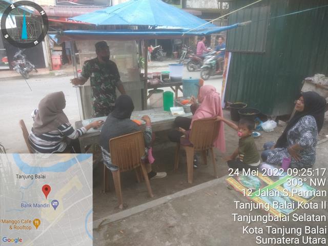 Tanjung Balai | Agar Warga Masyarakat yang berpergian keluar rumah tetap memakai Masker dan mengatur jarak selalu menjalankan Protokol Kesehatan maka dengan itu, seperti halnya yang dilakukan oleh Personel Bintara Pembina Desa (Babinsa) Koramil 09/Tanjung Balai jajaran Kodim 0208/Asahan Serda Rafles turun kewilayah binaan untuk melaskanakan kegiatan Komunikasi social (Komsos) bersama masyarakat menghimbau kepada masyarakat agar tetap meningkatkan disiplin dan penegakan hukum Protokol Kesehatan dalam pencegahan Virus Covid-19, bersama dengan Herlina (Pedagang), Rini Astuti (Warga Masyarakat) dan Ibu Risma (Warga Masyarakat), kegiatan tersebut yang dilaksanakan bertempat di Jalan S. Parman Kelurahan Tanjung Balai Kota II Kecamatan Tanjung Balai Selatan Kota Tanjung Balai, Selasa (24/05/2022).