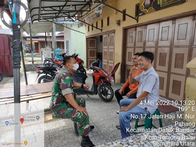 Tanjung Balai | Dalam masa Pandemi Covid 19 yang belum berakhir, dalam rangka agar terjalinnya komunikasi yang baik antara Babinsa dengan masyarakat, dalam hal ini Personel Bintara Pembina Desa (Babinsa) Koramil 17/Datuk Bandar jajaran Kodim 0208/Asahan Pelda JS. Manik turun kewilayah binaan untuk melaksanakan kegiatan Komunikasi Sosial (Komsos) mengajak serta menghimbau warga masyarakat yg belum melaksanakan Vaksin II dan ke III (Booster) atau yang belum vaksin supaya melaksanakan Vaksinasi, guna mempercepat penanganan virus Covid-19 sekaligus melaksanakan memberikan dan menghimbau masyarakat supaya tetap mematuhi protokol kesehatan serta untuk mempererat Hubungan antara Babinsa dan masyarkat agar lebih mudah mendapatkan informasi dan perkembangan situasi di wilayah Desa Binaan bersmaa dengan Bapak Rijal dan Bapak Rudi, kegiatan tersebut yang dilaksanakan bertempat di Jalan H.M. Nur Kelurahan Pahang Kecamatan Datuk Bandar Kota Tanjung Balai, Rabu (04/05/2022).