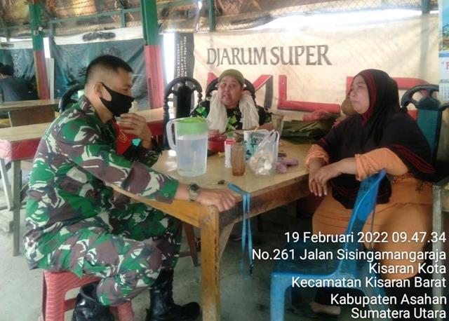 Asahan  |  Kerjasama Babinsa dengan Masyarakat guna meningkatkan kebersamaan serta  keharmonisan dalam rangka meningkatkan keimanan Guna mengetahui perkembangan di wilayah binaan serta agar terjalinnya hubungan yang harmonis antara masyarakat Desa binaan dengan Babinsa, dalam hal ini seperti yang dilakukan oleh Personel Bintara Pembina Desa (Babinsa) Koramil 06/Kisaran jajaran Kodim 0208/Asahan Sertu M. Yusuf Pangaribuan turun kewilayah binaan untuk melaksanakan Komunikasi Sosial (Komsos) bersama dengan Masyarakat Desa Binaan dalam rangka untuk menghimbau pemilik warung dan pengunjung agar selalu mematuhi  protokol kesehatan menyediakan tempat cuci tangan dan selalu menggunakan masker dimanapun berada guna mencegah menyebarnya virus Covid 19, kegiatan ini dbersama dengan Ibu Salimah, Ibu Suhartina dan Saudara Bahriadi, kegiatan tersebut yang dilaksanakan bertempat di Jalan Sisingamangaraja Kelurahan Kisaran Kota Kecamatan Kisaran Barat Kabupaten Asahan, Sabtu (19/02/2022).