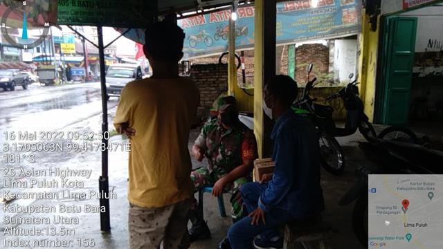 Batu Bara | Dalam rangka agar terjalin komunikasi serta tali silaturrahmi antara warga masyarakat dengan Babinsa, dalam hal ini seperti yang dilakukan oleh Personel Bintara Pembina Desa (Babinsa) Koramil 03/Lima Puluh jajaran Kodim 0208/Asahan Serda Sutikno turun kewilayah desa binaan untuk melaksanakan Komunikasi Sosial (Komsos) bersama dengan Kepala Lingkungan 1 Bapak Lubis dan warga masyarakat binaan menyampaikan kepada kepala lingkungan dan warga untuk selalu menjaga keamanan lingkungan dan mewaspadai pada musin penghujan tejadinya luapan air dari parit2 yang saluran airnya tidak lancar, sehingga kedepannya bisa dilaksanakan gotong- royong serta melaporkan hal-hal yang menonjol kepada Babinsa atau Bhabinkamtibmas, dengan menghimbau selalu menggunakan Masker bila setiap kegiatan dan melaksanakan prokes agar terhindar dari Covid-19, kegiatan tersebut yang dilaksanakan bertempat di Kelurahan Lima Puluh Kecamatan Lima Puluh Kabupaten Batu Bara, Senin (16/05/2022).