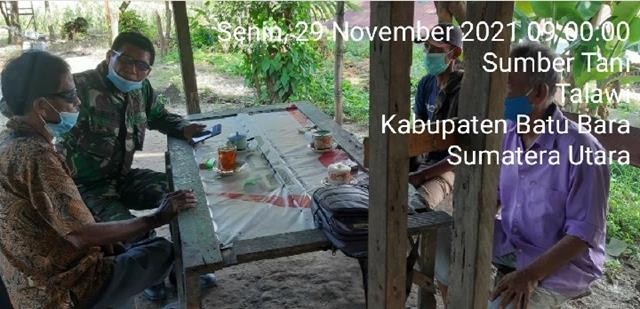 Batu Bara  |  Dalam rangka untuk menciptakan dan meningkatkan kerja sama yang baik, dan menjaga silatuhrahmi  antara TNI dengan masyarakat, untuk menciptakan kemanunggalan TNI dengan Rakyat serta untuk menjalin Silaturahmi dengan warga Binaan, dalam hal ini Personel Bintara Pembina Desa (Babinsa) Koramil 04/Talawi jajaran Kodim 0208/Asahan Serda B.P. Sidabutar turun kewilayah binaan untuk melaksanakan giat Komunikasi Sosial (Komsos) bersama warga binaan dalam rangka untuk  meningkatkan hubungan Erat Silaturahmi  dan Kerjasamanya yang baik untuk membantu tugas pokok Babinsa, kegiatan tersebut yang dilaksanakan bertempat di Dusun IV Desa Sumber Tani Kecamatan Datuk Tanah Datar Kabupaten Batu Bara, Senin (29/11/2021).