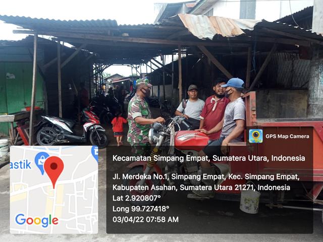 Asahan | Dalam rangka untuk menciptakan dan meningkatkan kerja sama yang baik, dan menjaga silatuhrahmi antara TNI dan Masyarakat, serta untuk menciptakan kemanunggalan TNI dan Rakyat, Dalam rangka pencegahan penyebaran Wabah Virus Corona (Covid-19), Personel Bintara Pembiona Desa (Babinsa) Koramil 11/Simapng Empat jajaran Kodim 0208/Asahan Sertu Azwar turun kewilayah binaan untuk melaksanakan Komunikasi Sosial (Komsos) bersama dengan Bapak Agusman yang bekerja sebagai Dinas Kebersihan Pajak Tradisional dan warga diwilayah binaan dengan menyampaikan himbauan tentang Disiplin Protokol Kesehatan diwilayah tersebut serta mengatakan dengan pengumpulan sampah setiap hari mengurangi polusi dan bau tak sedap dan masyarakat dipasar merasa nyaman untuk berbelanja, kegiatan tersebut yang dilaksanakan bertempat di Desa Simpang Empat Kecamatan Simpang Empat Kabupaten Asahan, Minggu (03/04/2022).