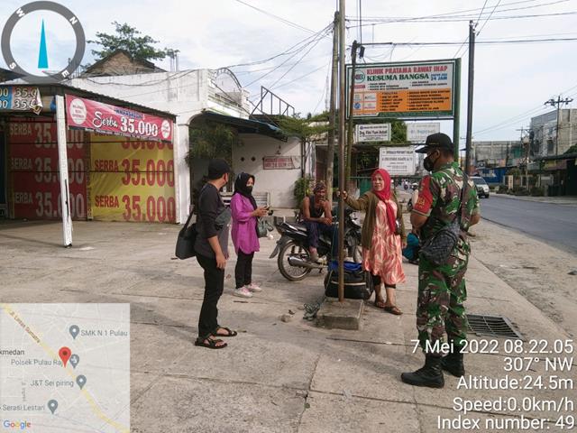 Simalungun | Tindak lanjuti surat edaran pemerintah tentang pembatasan masyarakat, dalam hal ini Personel Bintara Pembina Desa (Babinsa) Koramil 16/Pulau Rakayat jajaran Kodim 0208/Asahan Serma Syahminan dan 1 orang anggota Babinsa turun kewilayah binaan untuk melaksanakan kegiatan Komunikasi Sosial (Komsos) dengan menyampaikan Penegakan Disiplin Protokol Kesehatan di wilayah binaan dan himbauan agar selalu mematuhi Prokes kepada Masyarakat yang akan melaksanakan mudik serta mengingatkan agar menjaga faktor keselamatan diperjalanan bersama dengan Bapak Darmadi, Ibu Fatimah dan Bapak Heri, kegiatan tersebut yang dilaksanakan bertempat tepatnya di Jalinsum Dusun 1 Desa Pulau Rakyat Pekan Kecamatan Pulau Rakyat Kabupaten Asahan, Sabtu (07/05/2022).