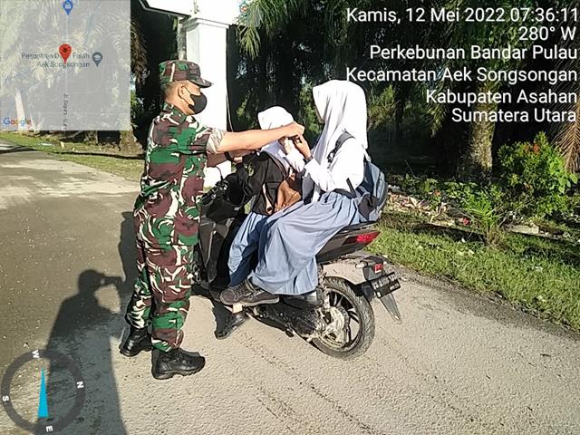 Asahan | Dalam rangka agar terciptanya silahturahmi yg baik antara TNI dengan masyarakat serta dalam rangka menjalin silaturahmi antara Babinsa dan warga untuk selalu mematuhi protokol kesehatan, inilah yang dilakukan oleh Personil Bintara Pembina Desa (Babinsa) Koramil 15/Bandar Pulau jajaran Kodim 0208/Asahan Sertu Aprianto turun kewilayah binaan untuk melaksanakan kegiatan kegiatan memberikan masker kepada Siswa/Siswi dan masyarakat yang melintas di jalan lintas si gura-gura supaya selalu menggunakan masker dan disiplin mematuhi protokol kesehatan covid -19, serta agar setiap berpergian wajib memakai masker dan selalu jaga jarak minimal 1 meter dan selalu hidup bersih agar terlindung dari penyebaran virus Corona Covid-19, kegiatan tersebut yang dilaksanakan bertempat di Jalan Lintas Sigura-gura Kecamatan Aek Songsongan Kabupaten Asahan, Kamis (12/05/2022).