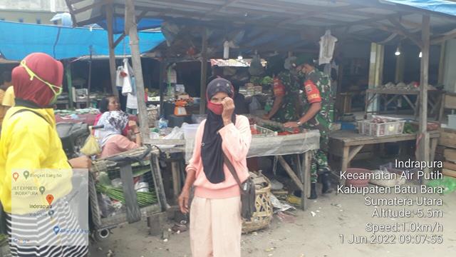 Batu Bara | Dalam rangka untuk melaksanakan Pam Disiplin Mandiri Covid-19 di Pasar Delima Indrapura menghimbau kepada para pedagang dan konsumen agar selalu mematuhi Protokol Kesehatan guna mencegah penyebaran virus covid-19. Dalam kesempatan ini Personel Bintara Pembina Desa (Babinsa) Koramil 02/Air Putih jajaran Kodim 0208/Asahan Peltu Budi S dan Serda Indra turun kewilayah binaan untuk melaksanakan kegiatan Pam Penegakan Disiplin Protokol Kesehatan diwilayah binaan, kegiatan tersebut yang dilaksanakan tepatnya di Pasar Delima Indrapura Kecamatan Air Putih Kabupaten Batu Bara, Rabu (01/06/2022).