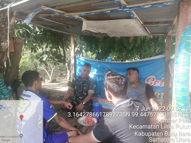 Batu Bara  |  Ini merupakan langkah upaya kita mencegah wabah virus corona ini. Dan diharapkan masyarakat dapat lebih koperatif dan mau bekerja sama tidak melakukan mudik demi kepentingan kesehatan bersama, dan juga supaya agar desa batu itam terhindar dari wabah virus ini, dalam hal ini Personel Bintara Pembina Desa (Babinsa) Koramil 03/Lima Puluh jajaran Kodim 0208/Asahan Serda Edi Rianto turun kewilayah binaan untuk melaksanakan kegiatan Komunikasi Sosial (Komsos) bersama dengan Kepala Dusun I dan Pemuda Desa Sumber Padi, menghimbau agar menghindari  Narkoba baik sebagai pengguna ataupun pengedar dan melaporkan kepada Babinsa atau Bhabinkamtibmas jika ada peredaran Narkoba ataupun pengguna, bersama dengan Kepala Dusun I Bapak Edi Purwanto dan Pemuda Desa Sumber Padi, kegiatan tersebut yang dilaksanakan bertempat di Desa Sumber Padi Kecamatan Lima Puluh Kabupaten Batu Bara, Selasa (07/06/2022).