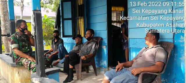 Asahan | Dalam rangka agar terjalinnya hubungan Komunikasi yang baik antara Warga masyarakat Desa Sei Kepayang Kanan dengan Babinsa Koramil 10/SK serta untuk memutus penyebaran Covid-19 diwilayah desa binaan, pada kesempatan tersebut Personel Bintara Pembina Desa (Babinsa) Koramil 10/Sei Kepayang jajaran Kodim 0208/Asahan Sertu Tugimin turun kewilayah desa binaan untuk melaksanakan kegiatan Komunikasi Sosial (Komsos) bersama dengan masyarakat desa binaan dalam rangka untuk membicarakan tentang Keamanan dalam hal bekerja agar lebih mewaspadai sehingga hal hal yang tidak diinginkan tidak akan terjadi, kegiatan komsosnya tersebut yang dilaksanakan bertempat di Desa Sei Kepayang Kanan Kecamatan Sei Kepayang Kabupaten Asahan, Minggu (13/02/2022).
