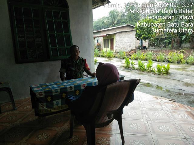 Batu Bara | Dalam rangka untuk memutus penyebaran Covid-19 diwilayah desa binaan, pada kesempatan tersebut seperti halnya yang dilakukan oleh Personel Bintara Pembina Desa (Babinsa) Koramil 04/Talawi jajaran Kodim 0208/Asahan Sertu N. Suprayetno turun kewilayah desa binaan untuk melaksanakan kegiatan Komunikasi Sosial (Komsos) bersama dengan masyarakat desa binaan / pengurus PKK Desa Perk Tanah Datar warga binaan membicarakan tentang Keamanan dalam hal bekerja agar lebih mewaspadai dan tetap jaga kesehatan di musim penghujan saat ini sehingga hal hal yang tidak diinginkan tidak akan terjadi, kegiatan ini dalam rangka untuk menciptakan dan meningkatkan kerja sama yang baik dan menjaga silatuhrahmi antara Babinsa dan Masyarakat/pengurus PKK serta untuk menjaga kemanunggalan TNI dan Rakyat, kegiatan komsosnya tersebut yang dilaksanakan bertempat di Dusun 3 Desa Perk. Tanah Datar Kecamatan Datuk Tanah Datar Kabupaten Batu Bara, Kamis (10/02/2022).