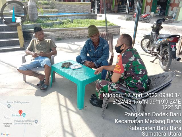 Asahan | Dalam rangka membina hubungan yang lebih erat lagi dengan warga binaan, dalam kesempatan ini Personel Bintara Pembina Desa (Babinsa) Koramil 01/Medang Deras jajaran Kodim 0208/Asahan Sertu M Kliwon turun kewilayah binaan untuk melaksanakan kegiatan Komunikasi Sosial (Komsos) bersama dengan warga Masyarakat desa binaan sekaligus membantu mengemasi barang dagangan milik warga di kedai milik Bapak Budi S di wilayah Desa Binaan dan tidak lupa untuk memngingatkan dan menghimbau agar selalu mencuci tangan dengan sabun, menggunakan masker dan menjaga jarak serta menghindari kerumunan guna mencegah penularan Covid-19 bersama dengan Bapak Alek dan Bapak Ariadi, kegiatan tersebut yang dilaksanakan bertempat di Kelurahan Pangkalan Dodek Baru Kecamatan Medang Deras Kabupaten Batu Bara, Minggu (17/04/2022).