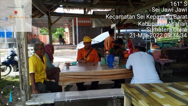 Asahan | Dalam rangka Terjalinnya komunikasi yang baik antara Masyarakat Desa Sei Jawi Jawi dengan Babinsa Koramil 10/SK serta membina hubungan yang lebih erat lagi dengan warga binaan, dalam hal ini seperti yang dilakukan oleh Personel Bintara Pembina Desa (Babinsa) Koramil 10/Sei Kepayang jajaran Kodim 0208/Asahan Serma Dtm Husni turun kewilayah binaan untuk melaksanakan kegiatan Komunikasi Sosial (Komsos) bersama dengan masyarakat Desa Sei Jawi Jawi agar selalu mematuhi Prootokol Kesehatan serta memberikan motivasi kepada warga agar tetap selalu menjaga kesehatan di masa pandemi, kegiatan tersebut yang dilaksanakan bertempat di Warung Nasi Ibu Inut Dusun V Desa Sei Jawi Jawi Kecamatan Sei Kepayang Barat Kabupaten Asahan, Senin (21/03/2022).