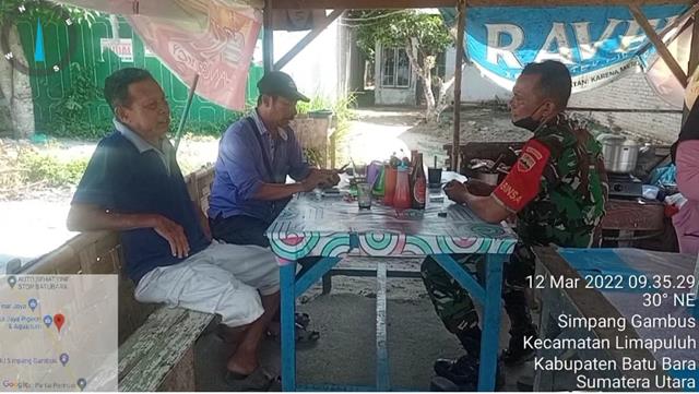 Batu Bara  |  Dalam rangka untuk menjalin silaturahmi bersam dengan warga binaan, dalam hal ini seprti yang dilakukan oleh Personel Bintara Pembina Desa (Babinsa) Koramil 03/Lima Puluh jajaran Kodim 0208/Asahan Serka IG. Sitorus turun kewilayah binaan untuk melaksanakan kegiatan Komunikasi Sosial (Komsos) dengan warga binaan dalam rangka membahas tentang menjaga kebersihan lingkungan dan kebersihan sungai agar  terlihat Bersih dan Indah bersama dengan Tomas Bapak Japar Hasibuan, Bapak Khoiruddin dan Ibu Hajizah, bertempat di Warung kopi Pak Ijal (57 tahun), kegiatan tersebut yang dilaksanakan bertempat di Dusun 06 Desa Simpang Gambus Kecamatan Lima Puluh Kabupaten Batu Bara, Sabtu (12/03/2022).