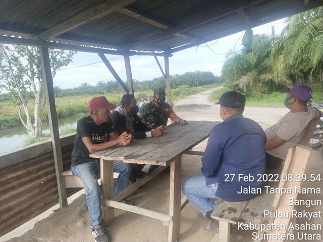 Seperti yang dilaksanakan oleh Personel Bintara Pembina Desa (Babinsa) anggota Koramil 16/Pulau Rakyat jajaran Kodim 0208/Asahan Kopda Bambang Hermanto turun kewilayah binaan untuk melaksanakan kegiatan Komunikasi Sosial kepada masyarakat diantaranya adalah Bapak Rahmat, Bapak Jasmin, Bapak Supardi dan Bapak Ponirin, kegiatan tersebut yang dilaksanakan bertempat di Dusun 1 Desa Bangun Kecamatan Pulau Rakyat Kabupaten Asahan, Minggu (27/02/2022).