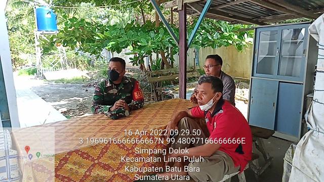 Batu Bara  |  Untuk menjalin silaturahmi dengan Kepling dan warga desa binaan, dalam hal ini seperti yang dilakukan oleh Personel Bintara Pembina Desaa (Babinsa) Koramil 03/Lima Puluh jajaran Kodim 0208/Asahan Serka A. Malau turun kewilayah binaan untuk melaksanakan kegiatan Komunikasi Sosial (Komsos) bersama dengan Kepala Dusun 3 Desa Simpang Dolok Bapak Jepri dan Warga Desa Simpang Dolok kegiatan komsos  bersama kadus dan Warga,  selain bersilaturahmi, juga bertujuan untuk meningkatkan kerja sama dalam rangka pengamanan lahan warga dari gangguan pencurian di lahan  masyarakat  dalam setiap melaksanakan kegiatan, termasuk untuk mendapatkan informasi tentang perkembangan dan situasi yang terjadi di wilayah binaan, kegiatan tersebut yang dilaksanakan bertempat di Desa Simpang Dolok Kecamatan Datok Lima Puluh Kabupaten Batu Bara, Sabtu (16/04/2022).