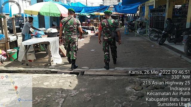Batu Bara | Cegah penyebaran Covid-19 diwilayah pasar, Personel Bintara Pembina Desa (Babinsa) Koramil 02/Air Putih jajaran Kodim 0208/Asahan Serma L. Marpaung dan Kopda SG. Tampubolon turun kewilayah binaan untuk melaksanakan kegiatan Pam Disiplin Mandiri Covid-19 di Pasar Delima Indrapura dengan menghimbau kepada para pedagang dan pembeli agar selalu mencuci tangan dgn sabun, menggunakan masker dan menjaga jarak serta menghindari kerumunan guna mencegah penularan Covid-19, kegiatan tersebut yang dilaksanakan bertempat di Pasar Delima Kelurahan Indrapura Kecamatan Air Putih Kabupaten Batu Bara, Kamis (26/05/2022).