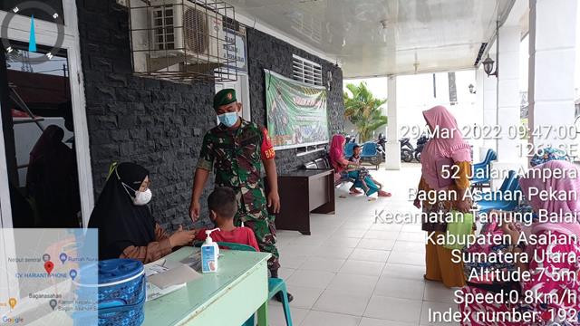 Asahan  |  Dalam rangka selalu melaksanakan pendampingan dan pemantauan dalam setiap kegiatan vaksinasi. Untuk mengantisipasi segala kemungkinan yang terjadi sehingga bila ada hal-hal menonjol, Babinsa dan unsur terkait bisa segera memberikan tindakan dengan cepat, seperti halnya yang dilakukan oleh Personel Bintara Pembina Desa (Babinsa) Koramil 08/Pulau Buaya jajaran Kodim 0208/Asahan Sertu Suwardi turun kewilayah desa binaan untuk melaksanakan kegiatan pendampingan Tim Vaksinator Puskesmas Bagan Asahan Disis 1 Dosis ll dan lll Booster untuk Masyarakat umum dan Anak sekolah agar tercapainya masyarakat yang sehat terhindar dari Covid 19 serta selalu mematuhi Prokes dan pemantauan pelaksanaan Vaksin diwilayah binaan bersama dengan Dr surya H (Kapus bagan) dan Ibu maryati sagala (Vaksinator), kegiatan tersebut yang dilaksanakan bertempat di Desa Asahan Kecamatan Tanjung Balai Kabupaten Asahan, Selasa (29/03/2022).