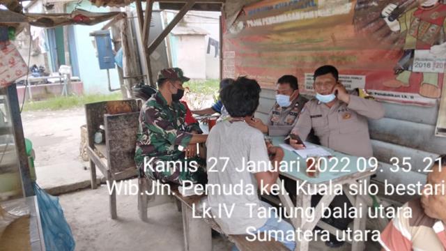 Tanjung Balai  |  Dalam rangka untuk menjalin silaturahmi yang baik antara Babinsa dengan Masyarakat selaku Mitra Karib dan mengetahui keluh kesah warga binaan, seperti yang dilakukan oleh Personel Bintara Pembina Desa (Babinsa) Koramil 09/Tanjung Balai jajaran Kodim 0208/Asahan Serda T Simarmata bersama dengan Bhabinkatibmas Polsek Tanjung Balai Utara turun kewilayah desa binaan untuk melaksanakan kegiatan Komunikasi Sosial (Komsos) bersama dengan Masyarakat selaku Mitra Karib guna memonitoring situasi di wilayah binaan bersama dengan Iptu Sofyan Bhabinkabtipnas, Bripka Bambang Bhabinkabtipnas, Bapak Agus Kepling II, Bapak Jufrin Tomas dan Bapak Surya Toda, kegiatan Komunikasi Sosial tersebut yang dilaksanakan bertempat di Jalan Pemuda Lingkungan IV Kelurahan Kuala Silo Bestari Tanjung Balai Utara Kota Tanjung Balai, Kamis (27/01/2022).