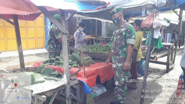Batu Bara | Aktivitas masyarakat di pasar tradisional menjadi perhatian dari tim gabungan satgas penanganan Covid-19 di daerah, dalam hal ini Para pedagang dan pengunjung merasa senang dengan adanya himbauan dari Babinsa, seperti yang dilakukan oleh Personel Bintara Pembina Desa (Babinsa) Koramil 02/Air Putih jajaran Kodim 0208/Asahan Peltu Budi. S dan Serda A. Tumanggor pun melaksanakan Pam Disiplin Mandiri Covid-19 di Pasar Delima Indrapura dengan menghimbau kepada para pedagang dan pembeli agar selalu mencuci tangan dengan sabun, menggunakan masker dan menjaga jarak serta menghindari kerumunan guna mencegah penularan Covid-19. Kegiatan tersebut bertempat di Pasar Delima, Kelurahan Indrapura, Kecamatan Air Putih, Kabupaten Batubara, Sabtu (07/05/2022).