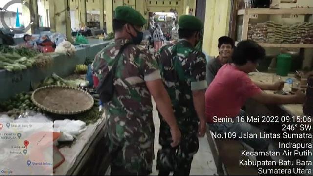 Batu Bara | Para pengunjung dan konsumen berterimakasih dengan adanya hmbauan dari Babinsa, dalam hal ini seperti halnya yang dilakukan oleh Personel Bintara Pembina Desa (Babinsa) Koramil 02/Air Putih jajaran Kodim 0208/Asahan Serma AL. Samosir dan Kopda Tampubolon turun kewilayah binaan untuk melaksanakan kegiatan Pam Disiplin Mandiri Covid-19 di Pasar Delima Indrapura menghimbau kepada para pedagang dan konsumen agar selalu mematuhi Protokol Kesehatan guna mencegah penyebaran virus covid-19, kegiatan tersebut yang dilaksanakan bertempat di Pasar Delima Indrapura Kecamatan Air Putih Kabupaten Batu Bara, Senin (16/05/2022).