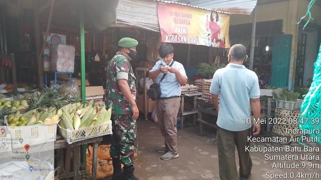 Batu Bara | Agar para pedagang dan pembeli didiplin dalam menerapkan protokol kesehatan untuk mencegah penularan Virus Corona atau Covid-19, seperti yang dilakukan oleh Personel Bintara Pembina Desa (Babinsa) Koramil 02/Air Putih jajaran Kodim 0208/Asahan Sertu Risman dan Serda Supardi turun kewilayah binaan untuk melaksanakan kegiatan Pam Disiplin Mandiri Covid-19 di Pasar Delima Indrapura dengan menghimbau kepada para pedagang dan pembeli agar selalu mencuci tangan dgn sabun, menggunakan masker dan menjaga jarak serta menghindari kerumunan guna mencegah penularan Covid-19, kegiatan terserbut yang dilaksanakan bertempat di Pasar Delima Kelurahan Indrapura Kecamatan Air Putih Kabupaten Batu Bara, Selasa (10/05/2022).