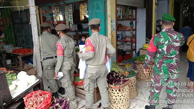 Batu Bara | Melaksanakan pengamanan disiplin mandiri covid 19 dipasar delima indrapura. Menghimbau kepada pedagang dan pembeli agar tetap menggunakan masker dan menjaga jarak dan tidak lupa mencuci tangan guna memutuskan penyebaran covid 19, seperti halnya yang dilakukan oleh Personel Bintara Pembina Desa (Babinsa) Koramil 02/Air Putih jaajran Kodim 0208/Asahan Serda Fahmi dan Serda Hendra turun kewilayah binaan untuk melaksanakan kegiatan Pengamanan Disiplin Mandiri Covid-19 di Pasar Delima Indrapura, kegiatan tersebut yang dilaksanakan bertempat di Pasar Delima Kelurahan Indrapura Kecamatan Air Putih Kabupaten Batu Bara, Jumat (17/09/2021).