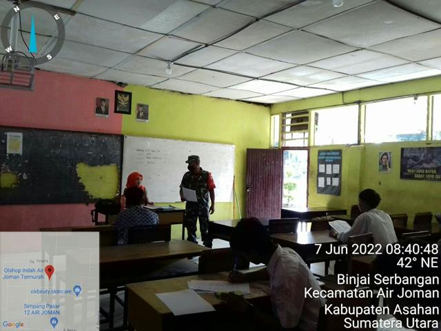 Asahan | Dalam rangka untuk menambahkan wawasan kebangsaan kepada para siswa diwilayah binaan, dalam hal ini seperti yang dilakukan oleh Personel Bintara Pembina Desa (Babinsa) Koramil 07/Air Joman jajaran Kodim 0208/Asahan Serka Syahdan turun kewilayah binaan untuk melaksanakan kegiatan Komunikasi Sosial (Komsos) dan laksanakan Wasbang ke SMA Daerah Swasta Air JomanKomsos dilaksanakan dengan cara memberikan sosialisasi Wasbang kepada Siswa/i Kls-X dengan materi Memperingati hari lahir Pancasila agar para siswa dapat menghayati dan mengamalkan nilai nilai Pancasila dlm kehidupan sehari-hari, bersama dengan Guru Kelas (Ibu Leni) dan Para Siswa/i Kls-X (20 org), kegiatan tersebut yang dilaksanakan bertempat di Lingkungan-VI Kelurahan Binjai Serbangan Kecamatan Air Joman Kabupaten Asahan, Selasa (07/06/2022).