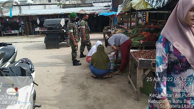 Batu Bara | Melaksanakan patroli disiplin mandiri covid 19 dipasar delima indrapura menghimbau kepada pedagang dan pembeli agar tetap menggunakan masker dan menjaga jarak serta tidak lupa mencuci tangan guna memutuskan penyebaran covid 19, dalam rangka untuk memutus penyebaran virus corona (Covid-19) diwilayah binaan, seperti halnya yang dilakukan oleh Personel Bintara Pembina Desa (Babinsa) Koramil 02/Air Putih jajaran Kodim 0208/Asahan Sertu David dan Kopda Tampubolon turun kewilayah binaan untuk melaksanakan kegiatan Pam Disiplin Mandiri Covid-19 di Pasar Delima Indrapura menghimbau kepada para pedagang dan konsumen agar selalu mematuhi Protokol Kesehatan guna mencegah penyebaran virus covid-19, kegiatan tersebut yang dilaksanakan bertempat di Pasar Delima Indrapura Kecamatan Air Putih Kabupaten Batu Bara, Senin (25/04/2022).