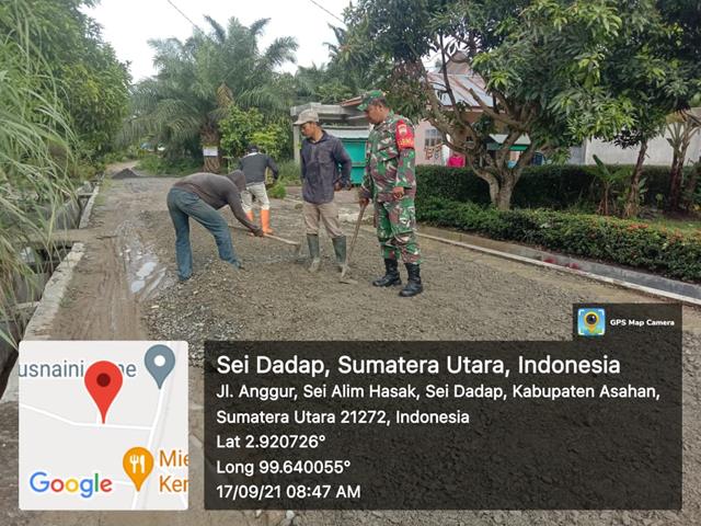 Asahan | Bagi kami program karya bhakti bersama warga masyarakat sangat penting, akan kami laksanakan secara berkelanjutan sehingga kehadiran TNI di tengah masyarakat bisa memberikan dorongan semangat serta motivasi guna mencintai lingkungan dan bergotong royong memperbaiki desanya, seprti halnya yang dilakukan oleh Personel Bintara Pembina Desa (Babinsa) Koramil 12/Air Batu jajaran Kodim 0208/Asahan Peltu Sofiansah Sitorus turun kewilayah desa binaan untuk melaksanakan kegiatan Pendampingan dan Komunikasi sosial dengan pekerja pengaspalan jalan di desa wilayah binaan, kegiatan tersebut yang dilaksanakan bertempat di Jalan Anggur sepanjang 220 M tepatnya di Dusun II Desa Sei Alim Hasak Kecamatan Air Batu Kabupaten Asahan, Jumat (17/09/2021).
