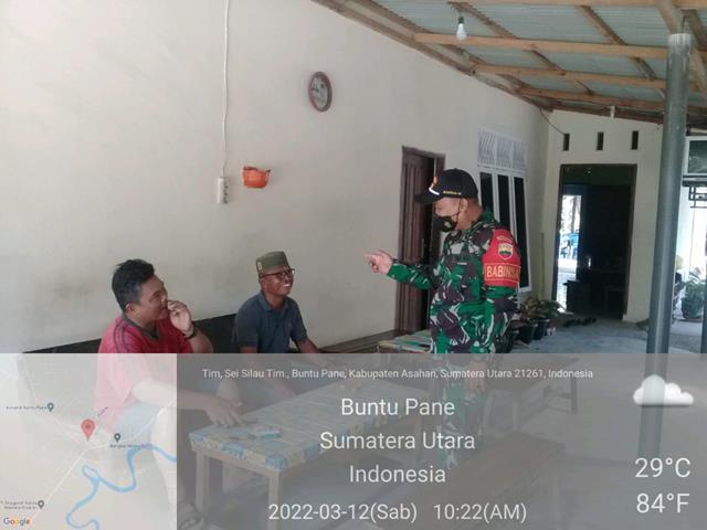 Asahan  |  Dalam rangka pencegahan penyebaran Wabah Virus Corona (Covid-19), dalam hal ini seprti yang dilakukan oleh Personel Bintara Pembina Desa Koramil 13/Buntu Pane jajaran Kodim 0208/Asahan Serda Sugeng turun kewilayah desa binaannya untuk melaksanakan Komunikasi Sosial (Komsos) kepada masyarakat desa binaan dalam rangka agar terciptanya Keharmonisan dan keakraban antara masyarakat dan TNI, kegiatan ini dilakukanbersama dengan Bapak Nasution selaku tokoh agama dan Bapak Wanda selaku Tokoh pemuda, kegiatan tersebut yang dilaksanakan bertempat di Desa Sei Silau Kecamatan Buntu Pane Kabupaten Asahan, Sabtu (12/03/2022).